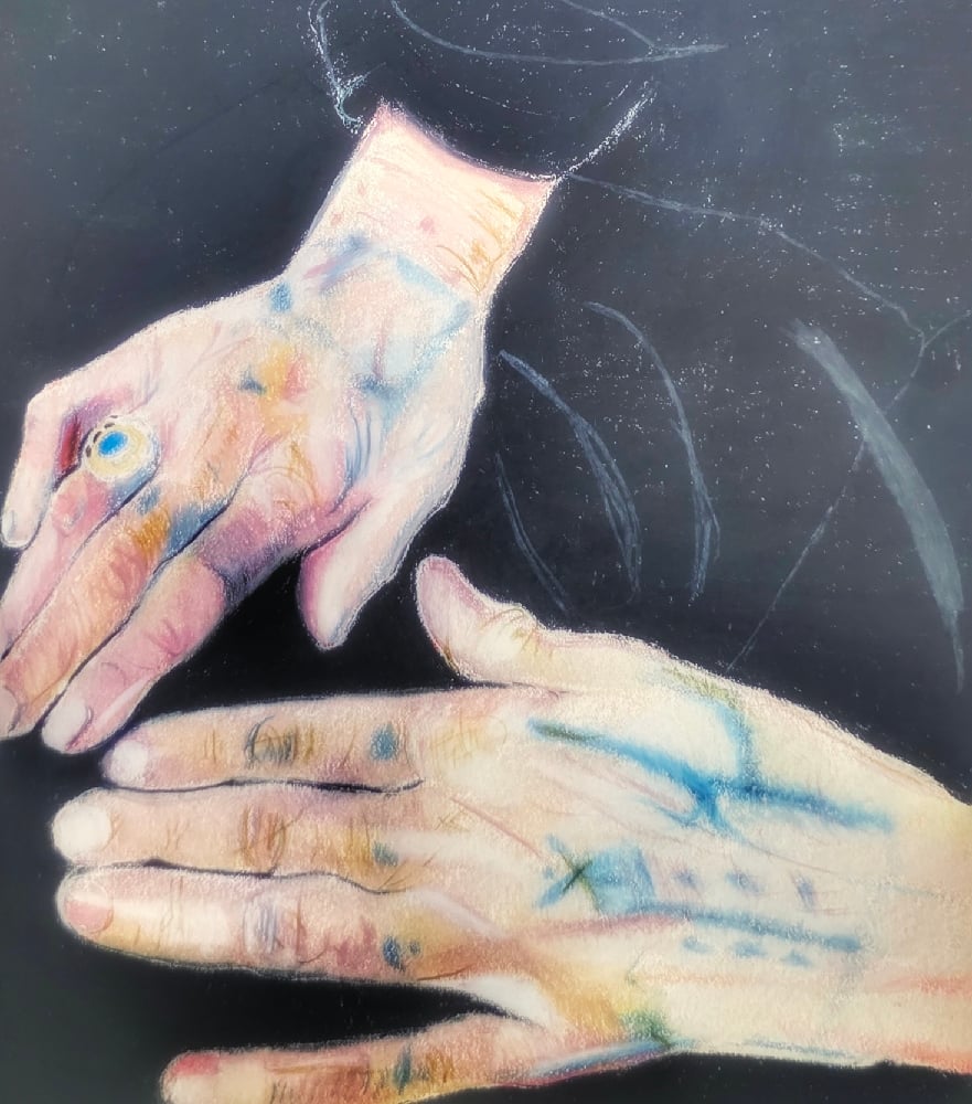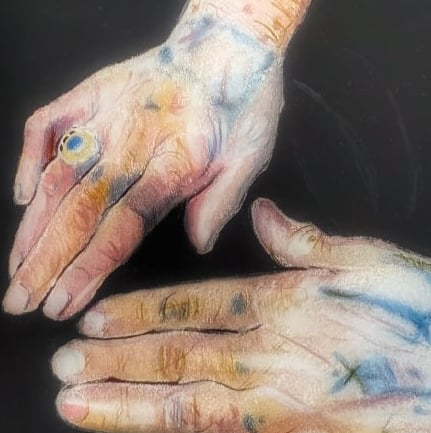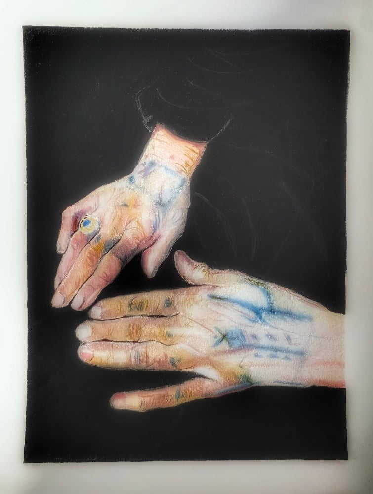 Daughter of the Sun is an evocative exploration of identity and light. Set against an infinite black expanse, these hands tell a story of life etched in skin. Through a delicate balance of realism and symbolic color, the piece captures the radiant energy that remains long after the sun has set.