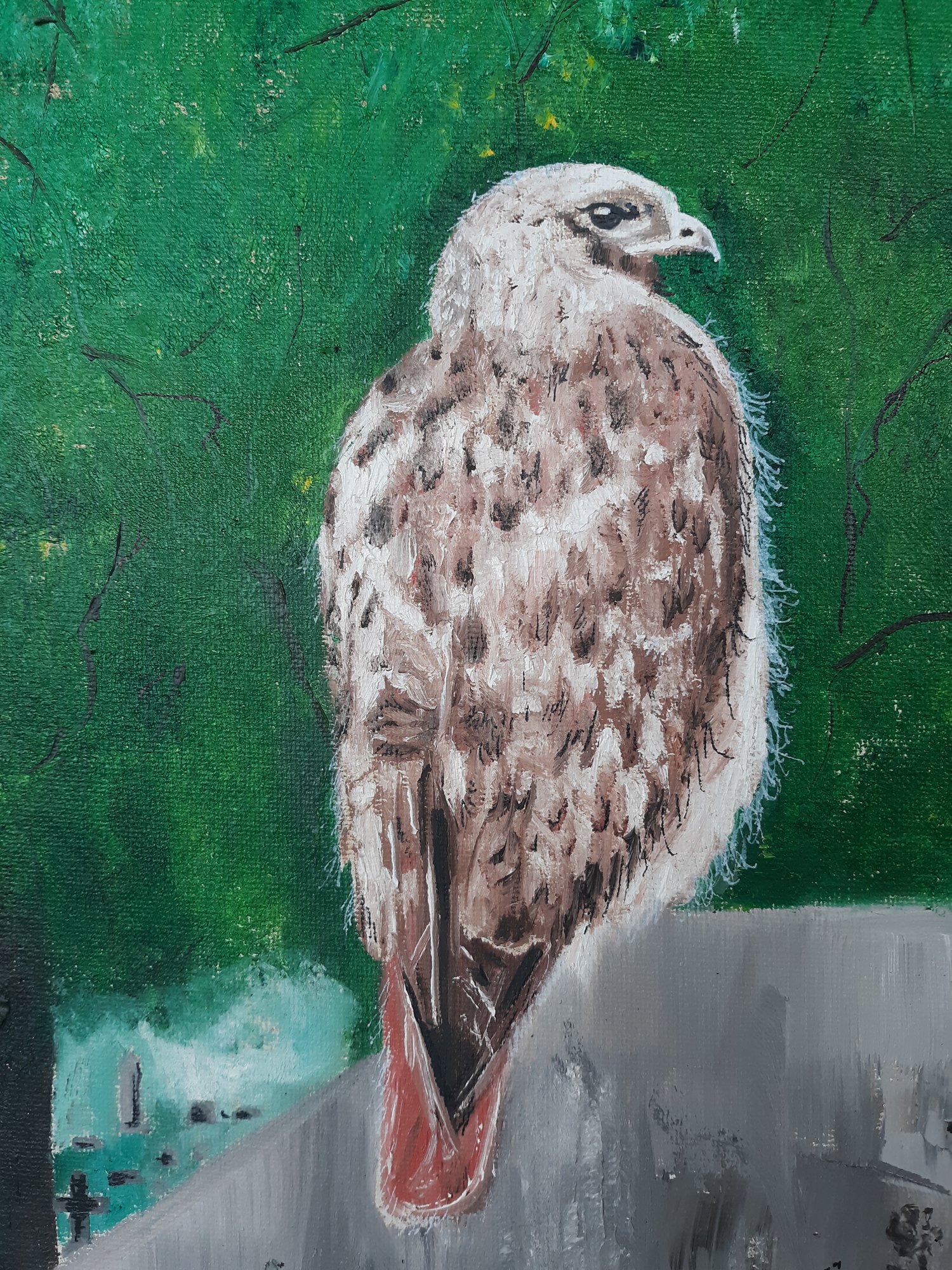 Here we have a beautiful original oil on canvas size 12x14, titled 'Misty Mourning hawk at Maple Hill'